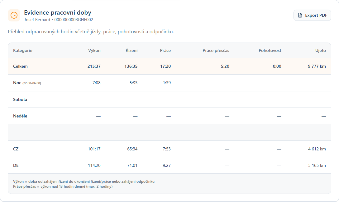 Vytvořte si z dat na kartě řidičů evidenci pracovní doby řidičů: