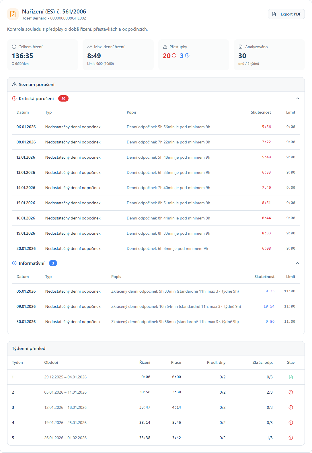Vytvořte si z dat na kartě řidičů orientační vyhodnocení nařízení 561/2006: